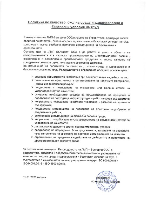 LMP-Bulgaria has developed, implemented and maintains an integrated system for Quality, EnvironmentHealth and Safety Management at work, in accordance with the requirements of below international standards: